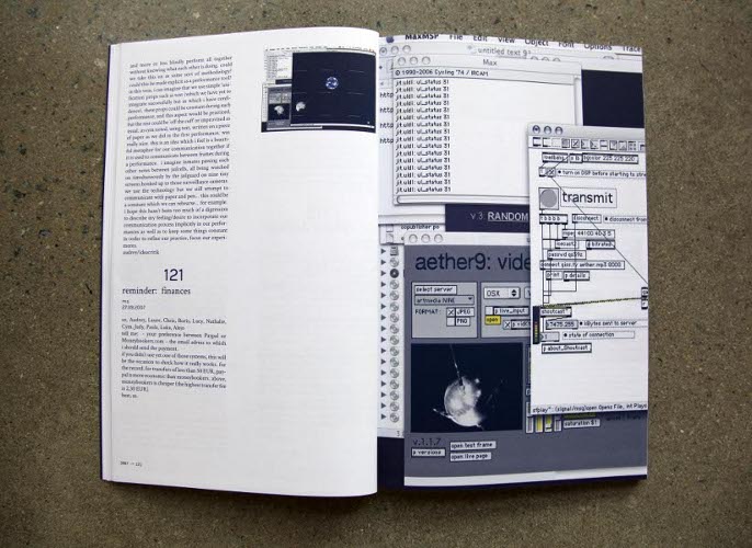 Aether9 is a collaborative adventure exploring the danger zones of networked audio-visual live performance. This catalogue of their work was generated from the collection of images, mailing-list and chat interactions that developed between 2007 - 2010. The process, behind-the-scenes discussions and perils of networked communication, technical pitfalls, and script development, can thus be followed from performance to performance.