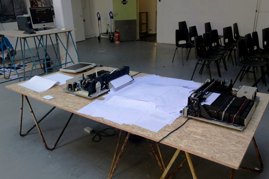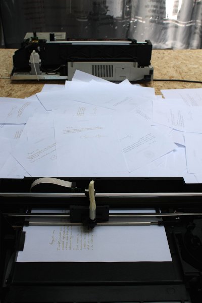 In the installation I've juxtaposed two pen plotters. One writes quotes as the 'candidate' Obama in gold, the other responds as the 'president' Obama in blue fountain pen. They alternately write a letter after it is signed, it's flung away by the machine. Over time these letter form a pile in-between the plotters in which Obama continually contradicts himself on i.e. PRISM, transparency and Guantanamo Bay.
